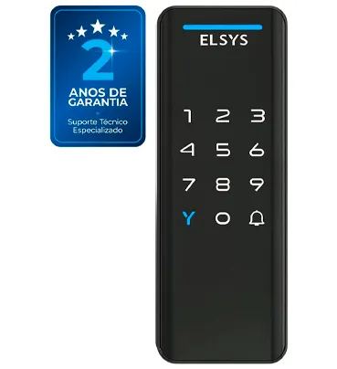 A fechadura digital de sobrepor que escolhemos foi a fechadura eletrônica Elsys, modelo Elsys DS1100V — também chamada de fechadura digital Elsys pop. Ela funciona com travamento automático e oferece várias opções de abertura: por senha numérica, cartão, tag ou adesivo.